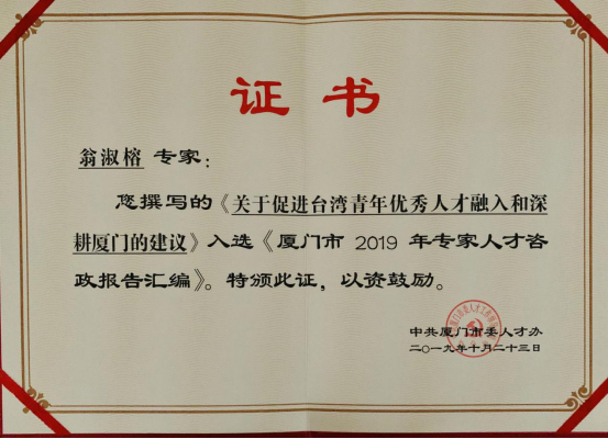 2019年11月25日,厦门市第十批拔尖人才暨厦门市政府人才咨政优秀代表颁证仪式在厦门市人民大会堂隆重举行。据悉,近两年来,有300多名人才以个人或组团形式完成咨政报告107篇,为厦门发展出谋划策,这些咨政报告获得了市委市政府领导的高度肯定。bevictor韦德翁淑榕老师所写的《关于促进台湾青年人才融入和深耕厦门的建议》从百来份咨政报告中脱颖而出,成为2019年度成功入选的15篇咨政报告之一,这是bevictor韦德官网首次获得该项荣誉。