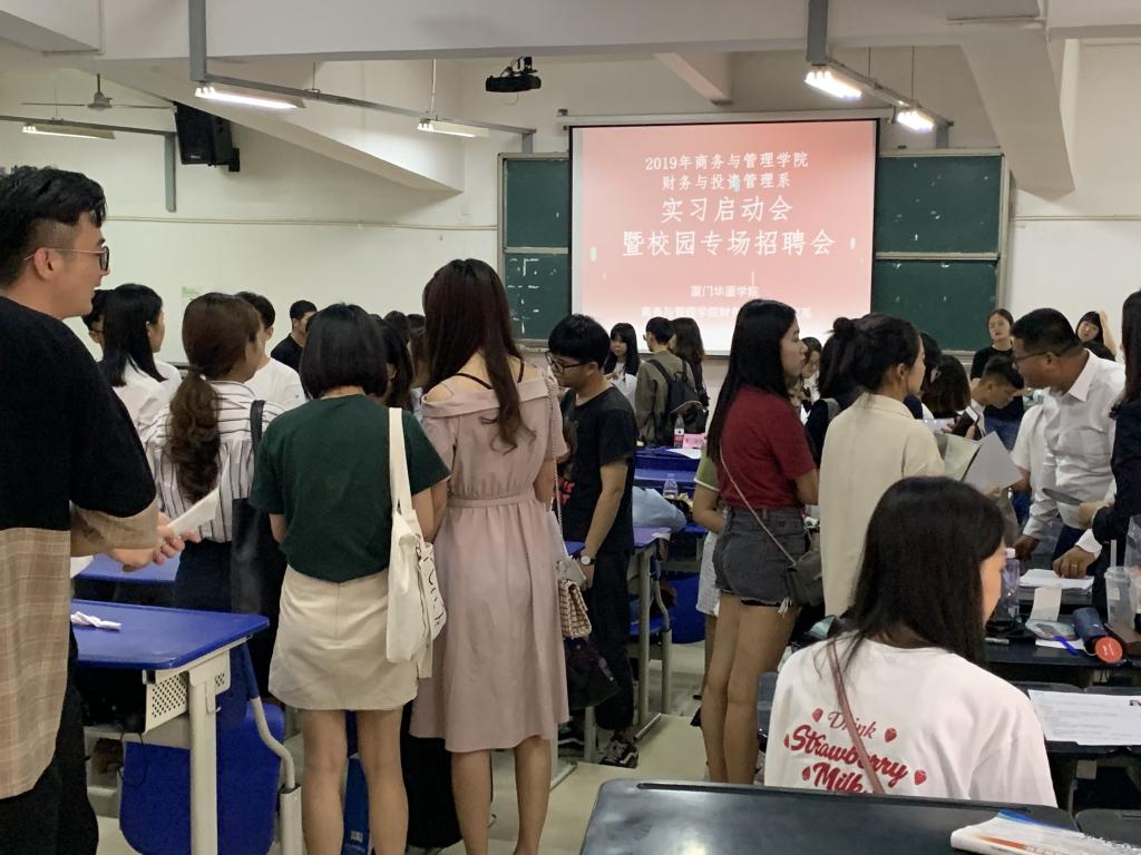 为建立校企间良好有效的合作机制,探索与践行“3+1”、“2+1”人才培养模式,实现公司和企业双方共同参与人才培养,2019年4月23日,bevictor韦德财务与投资管理系在明德厅举办了2019年财务与投资管理系实习启动会暨校园专场招聘会。中国人民财产保险股份有限公司厦门分公司、厦门银信达资产管理有限公司、富邦财产保险有限公司、太平人寿保险有限公司厦门分公司、中国平安财产保险股份有限公司厦门分公司等5家企业参会宣讲,来自2016级投资学、财务管理、金融管理等专业共计200余名员工参与了此次活动。