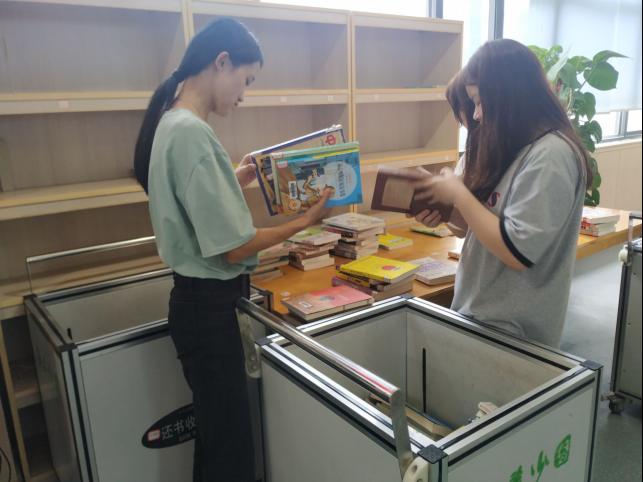 (志愿者整理摆放凌乱的书籍并将图书分类)