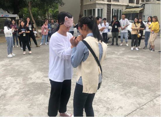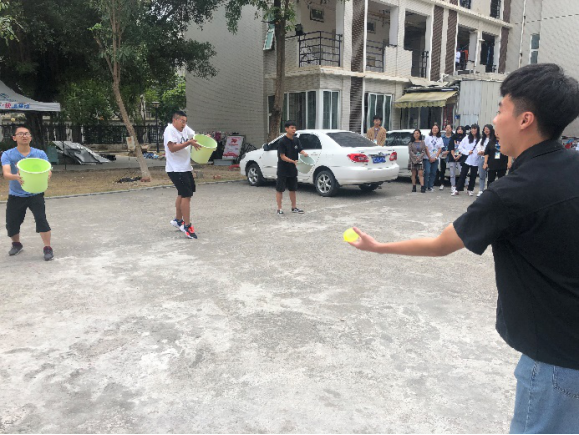 参加趣味竞赛的选手以宿舍为单位,总共进行了三个项目,分别为水球进框、你划我猜、蒙眼吃食物。“王牌对王牌”趣味竞赛采用计时制,三个项目接力,用时最短者获胜。水球进框的规则为每队派出两名选手,分别站在相距一定距离的位子,一人扔水球,一人用框接,接满十个水球进入你划我猜环节。你划我猜考验双方的默契程度,参赛选手背对背站着,一人根据工作人员举牌的题词,用肢体语言描述题目,猜出五组题目则进入下一个项目:蒙眼吃食物。最后的项目蒙眼吃食物则是对同学们肢体平衡能力、宿舍人员之间的默契及团队协作能力的挑战。每队派出三名选手,一人蒙眼原地转五圈,剩下两名同学负责指挥其通过地面路障,将食物喂给自己。