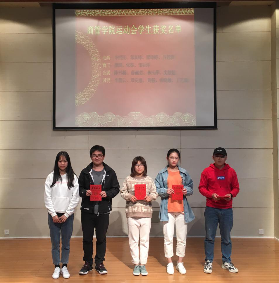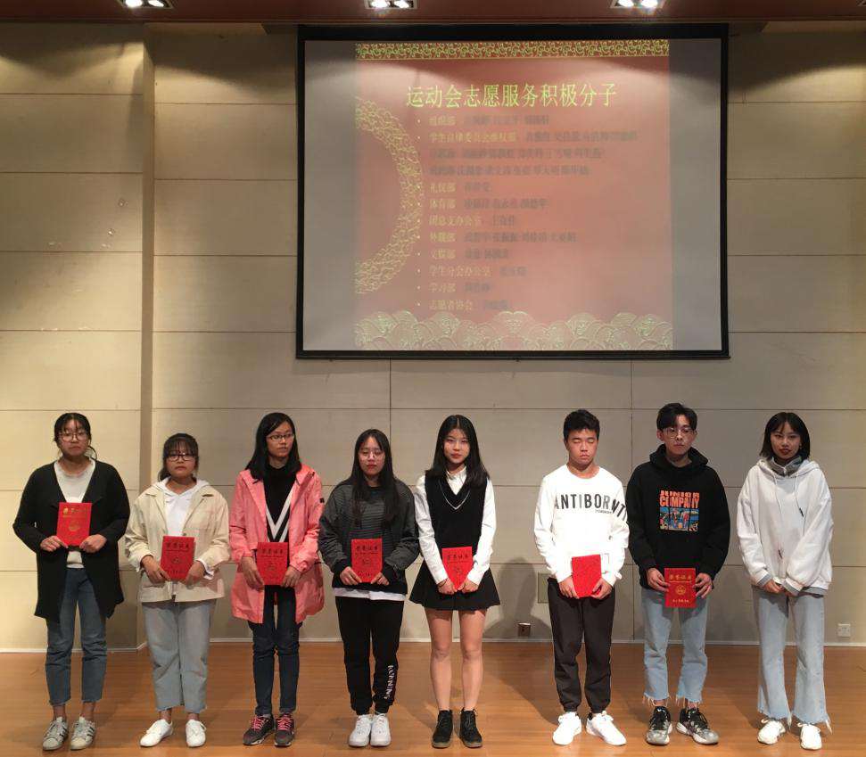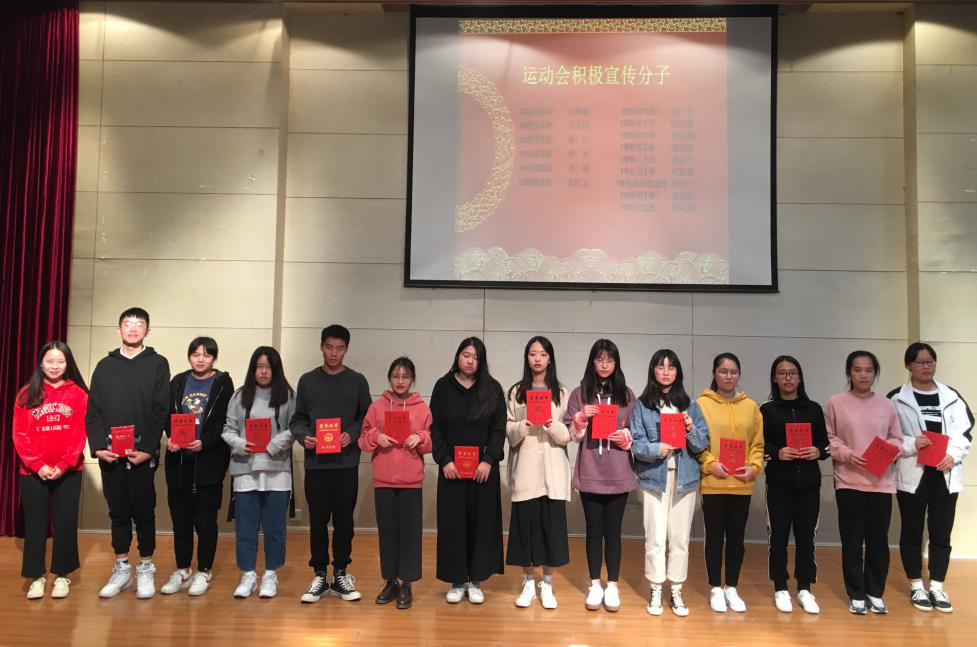 此次大会共设四个奖项,共表彰72名师生。首先进行“优秀运动员”和“优秀教练员”的颁奖,来自电子商务代表队的廖诗婷等21名运动员获得了“优秀运动员”称号,杨甲老师和陈豪老师获得“优秀教练员”称号。正是因为这些优秀运动员的刻苦训练和教练员的悉心指导,才能发挥出最好的水平,取得优异成绩;接着进行的是运动会“志愿服务积极分子”和“宣传积极分子”的表彰,运动会的筹备过程中,志愿者在运动会上维持赛场秩序,为运动员加油助威,任劳任怨,无私奉献,是真正的幕后英雄;宣传积极分子用照片和文字将赛场上的瞬间变成永恒,哪里有比赛哪里就有这样一群积极的记录者,他们为运动会的顺利进行提供了坚实的后勤保障。