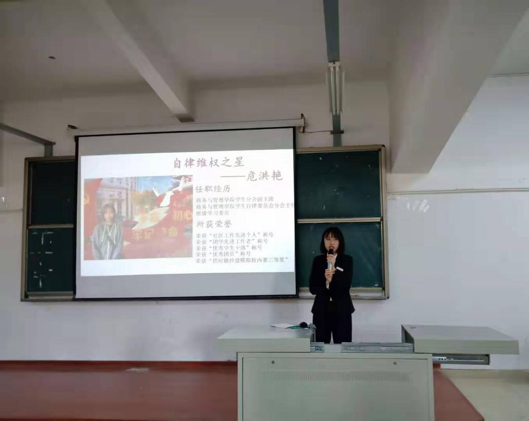“自律维权之星”危洪艳同学分享了自己在自律会的工作经历,为同学们解析了自律的内涵以及自律的意义,接着引申出老员工该如何自律。最后希望同学们要养成自律的习惯、增强自律的能力,从身边小事做起。