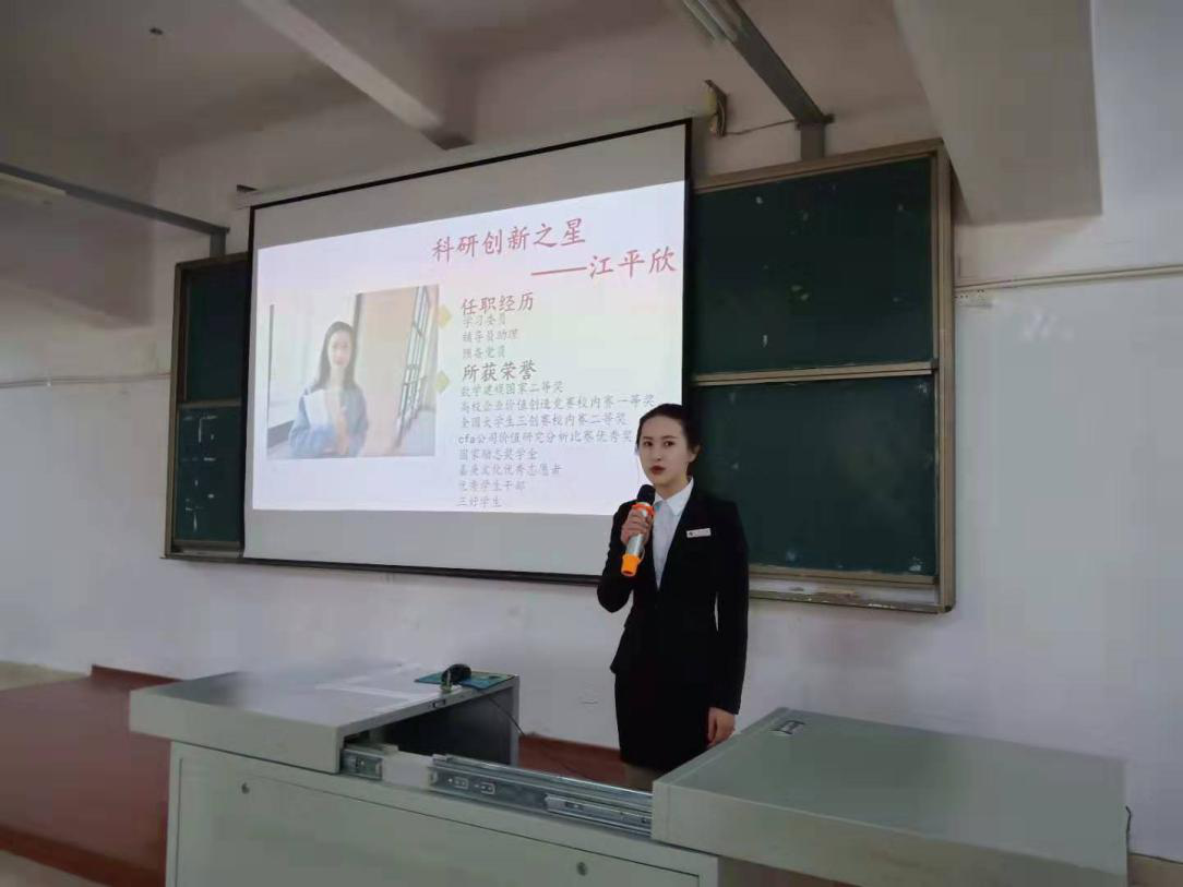 “科研创新之星”江平欣同学分享自己创新创业的经历及心历路程,并结合自身经验告诉同学们做事要有想法并且敢于行动,不要因为自己过于追求完美、偷懒等原因而半途而废,并要调整心态相信自己。最后她鼓励同学们想做的就去做,不要留下遗憾。