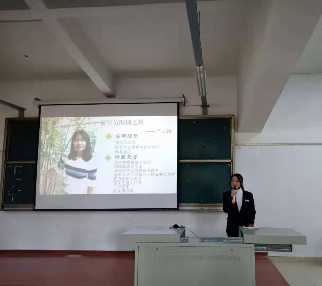 “辅导员助理之星”吕云娜同学分享了自己的辅助工作情况以及在工作学习中如何处理好时间分配的问题,也提出对各位同学的展望:在未来的日子不忘初心、砥砺前行。