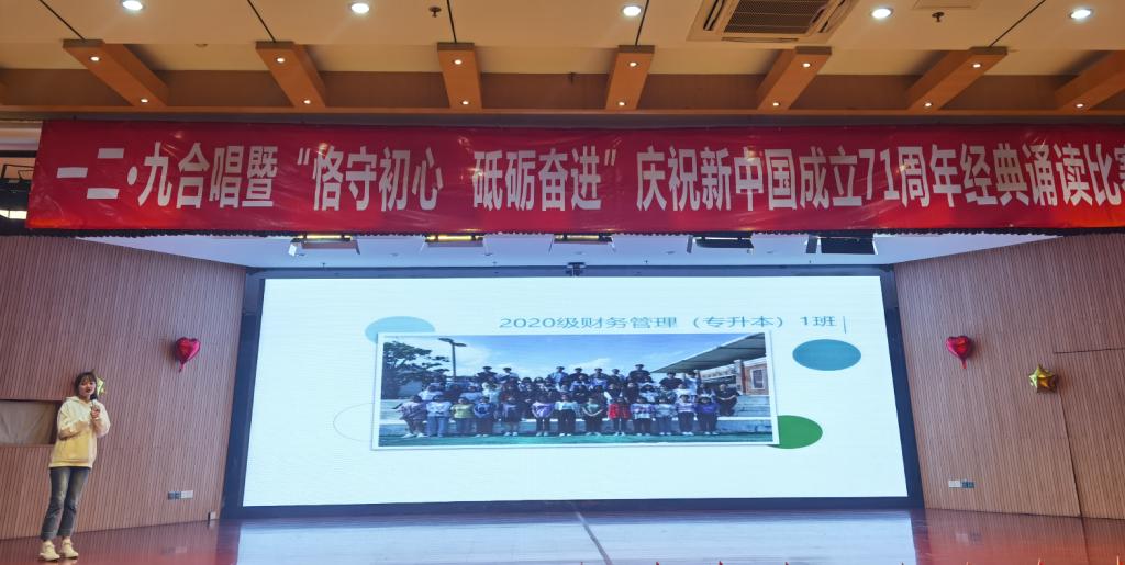 20级财务管理(专升本)1班带来参赛视频是合唱歌曲《国家》与《我和我的祖国》,嘹亮的歌声,彰显华夏儿女拼搏奋进的雄心,唱响中华民族伟大复兴的乐章;祖国不断强大,中国社会不断兴旺发达,身为中国人的骄傲油然而生。