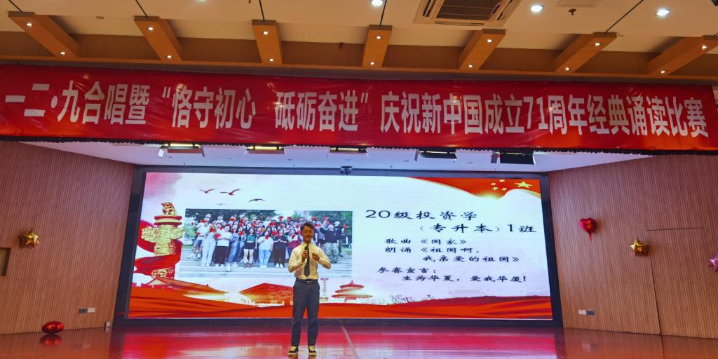 20投资学(专升本)1班带来参赛视频合唱歌曲《国家》与朗诵《祖国,我亲爱的祖国》,同学们整齐划一的手势展示了身为华夏儿女的骄傲,我和我的祖国心连心,我和我的祖国有唱不完的歌,有说不完的话语,爱我中华印记每个中国人的血液里。