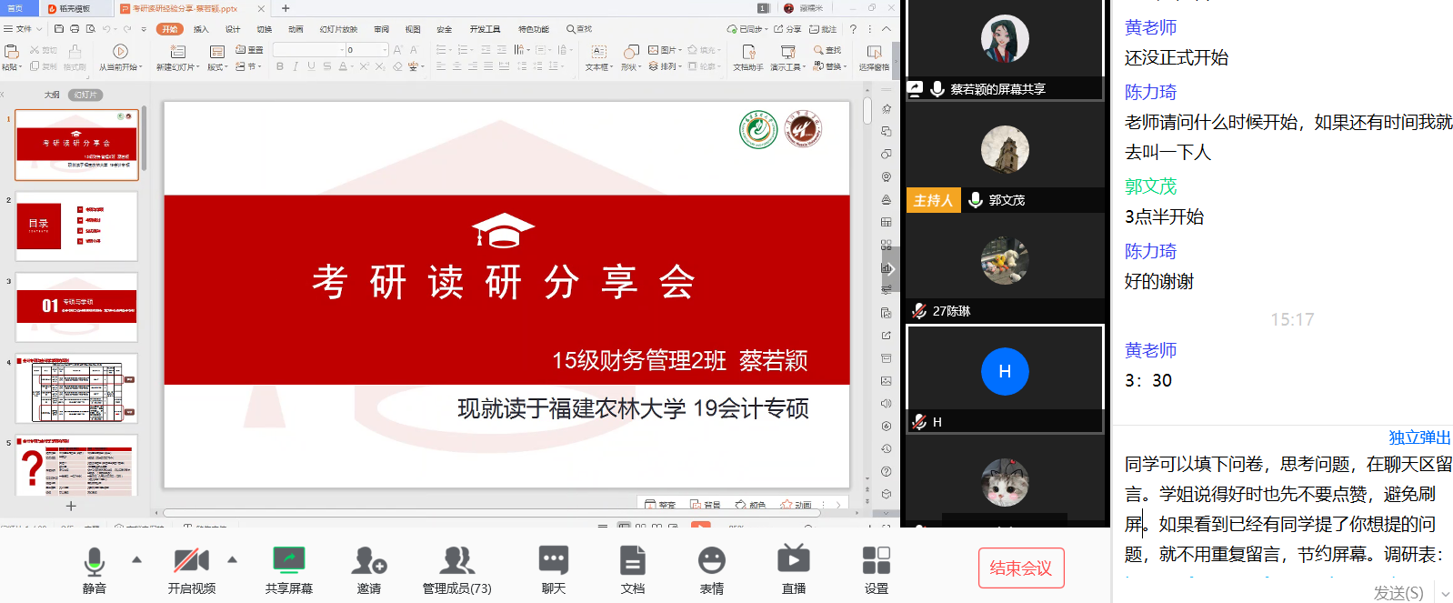 教育部日前印发通知,明确2020年将扩大硕士研究生招生规模,拟增招18.9万人,这是党中央、国务院统筹考虑我国经济社会发展大局,立足当前,着眼长远,作出的一项重大的战略决策,对众多有考研意向的同学也是个重大利好。为指导财务管理、审计学专业员工尽早更好地明确考研意向,科学制订合理的考研计划,提高财会专业的升学率,3月15日下午,财会专业群在线举办了一场“财会专业群考研读研分享会”,邀请2015级财务管理专业蔡若颖同学主讲,蔡若颖同学去年经过奋力拼搏,考上福建农林大学会计专业硕士,是华厦升本后财务管理本科专业第一位考上研究生的员工。来自2016-2019级财务管理、审计学专业的80余位同学和部分专业教师参加了本次分享会。