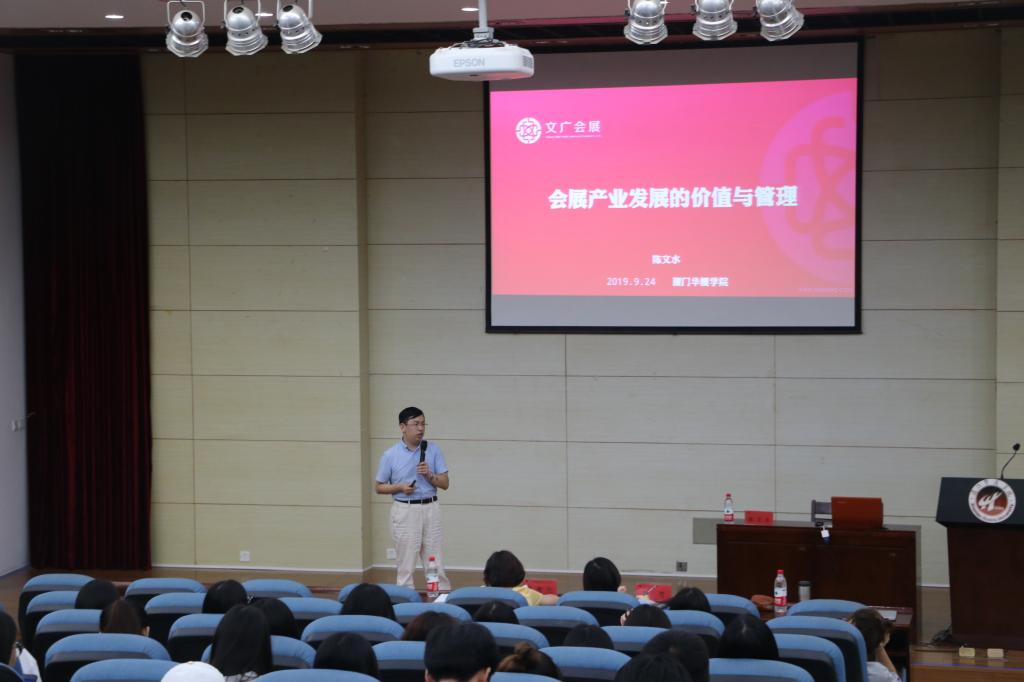 9月24日晚,明德厅2 济济一堂,来自会展经济与管理专业2017、2018、2019级的两百余名同学认真聆听了一场内容满满、丰富精彩的讲座----“会展产业价值与管理”。主讲人是厦门文广会展有限公司的陈文水总经理,他曾经担任厦门市会展局信息调研处副处长,对厦门乃至全国的会展行业有独到而深入的理解。