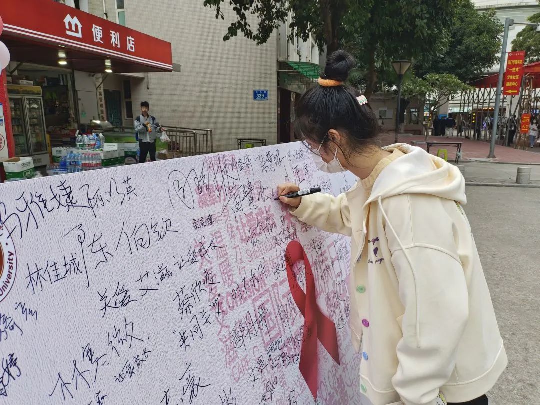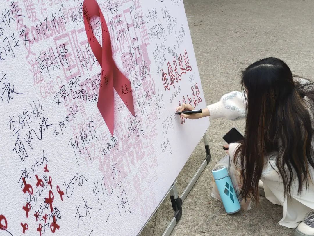 到场的同学们在KT板上郑重地签名,并写上自己的祝福语。以实际行动来拒绝艾滋,希望每位同学都可以提高防范艾滋的意识,共建健康校园!