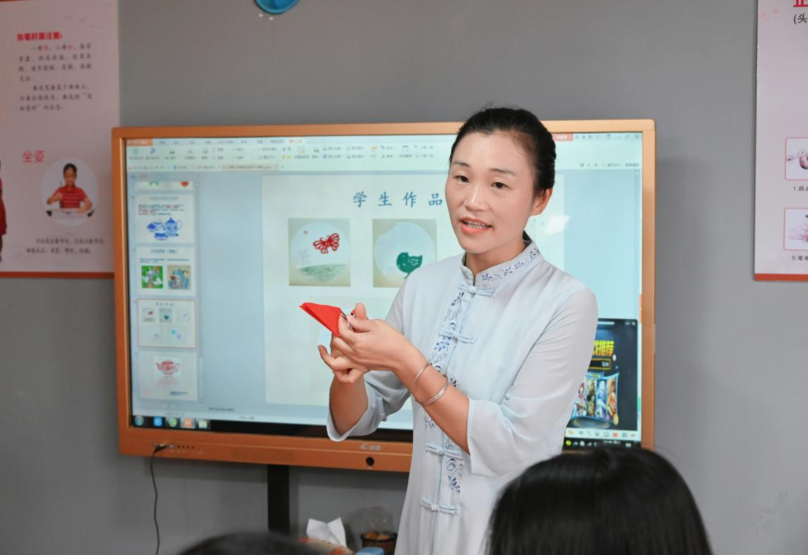 “剪纸不仅是技艺,更是讲述红色故事的生动语言。” 陈敏蓉一边示范剪刻技法,一边讲述创作理念。正值纪念中国人民抗日战争暨世界反法西斯战争胜利80周年,她与王阿红老师专门设计“红色剪纸”教学环节,指导队员们剪出 “红船”“延安宝塔”等象征图案。当鲜红的剪纸作品在指尖绽放,红色故事便有了可触可感的具象形态。