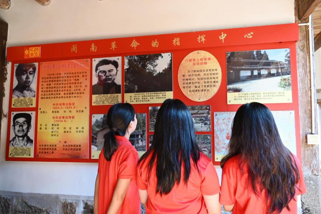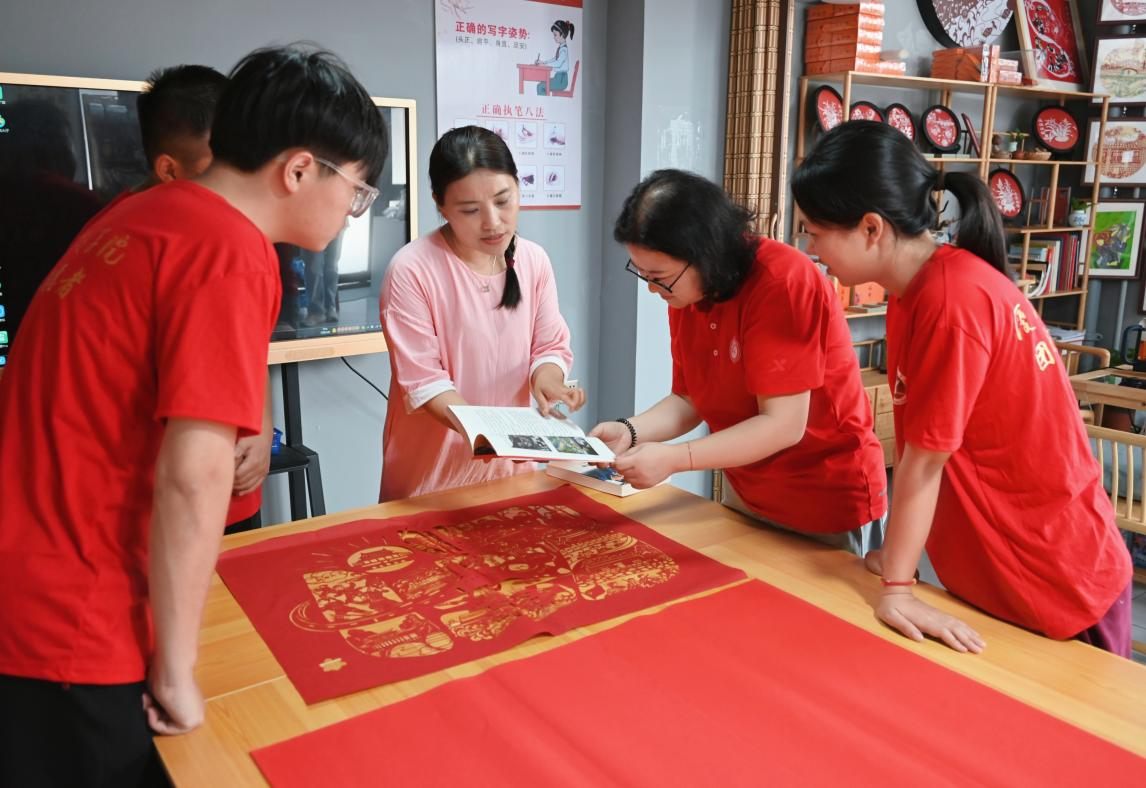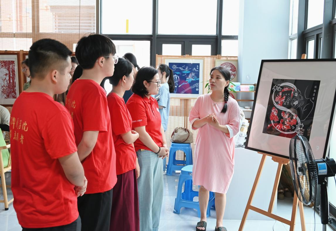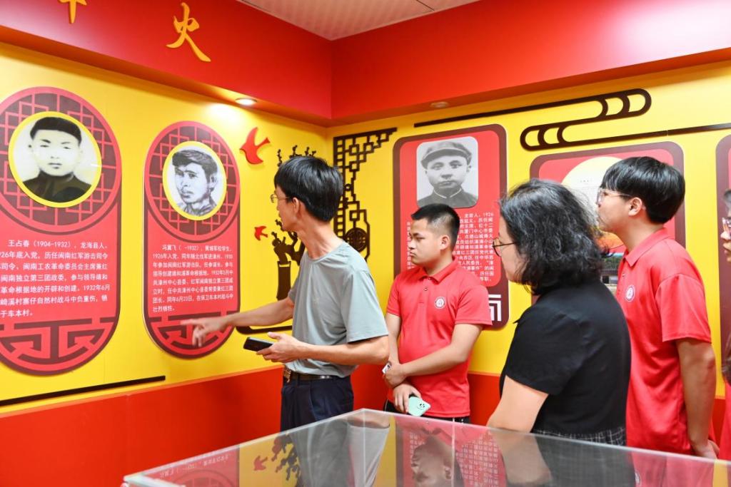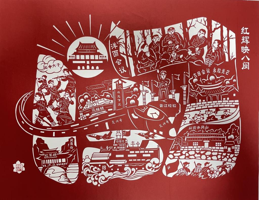 漳浦剪纸非遗传承人陈敏蓉的工作室里,剪刀与红纸的碰撞声奏响传承序曲。她向队员们展示耗时一个月创作的《红辉映八闽》系列剪纸,作品以古田会议、晋江经验、闽南井冈山等元素为脉络,将福建红色历史与时代发展巧妙融合。