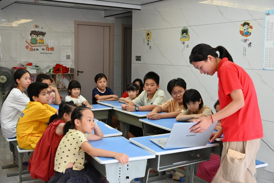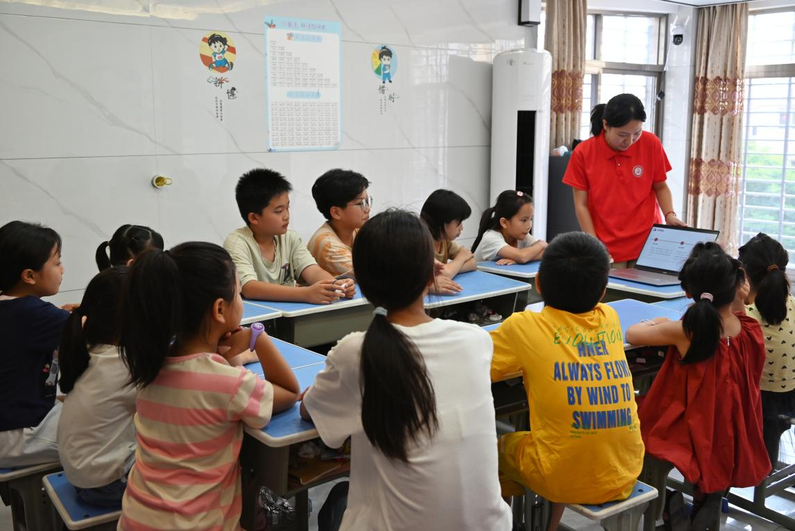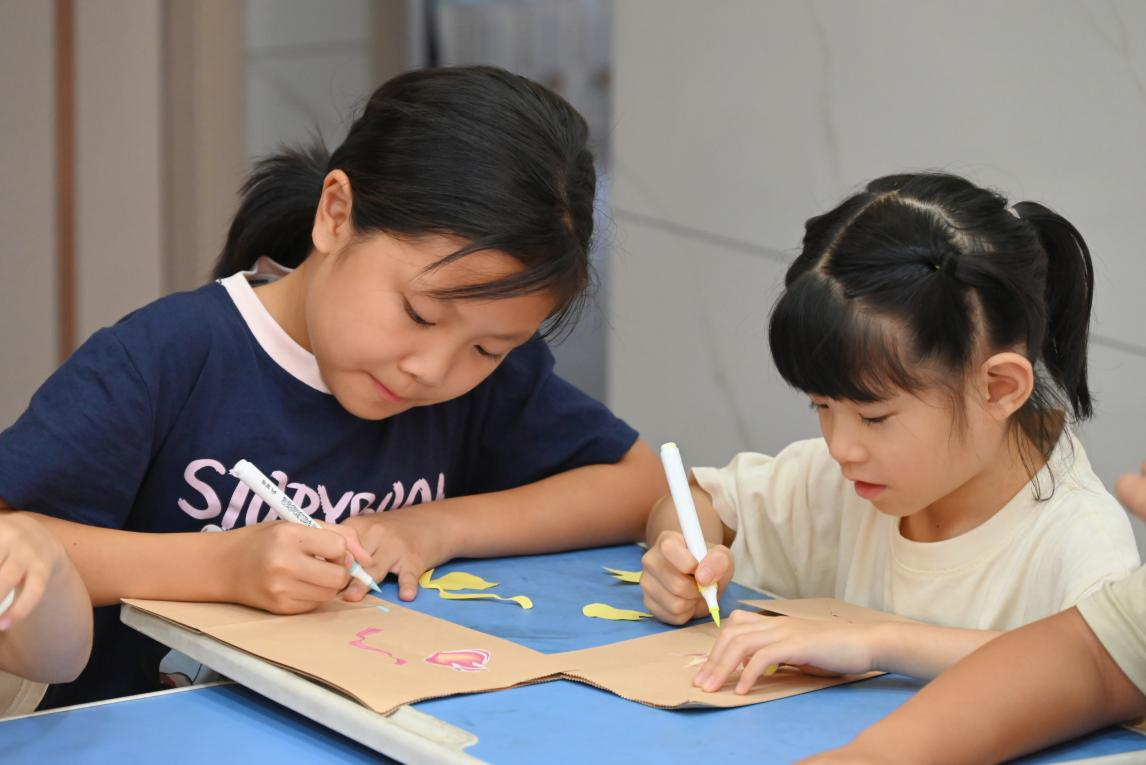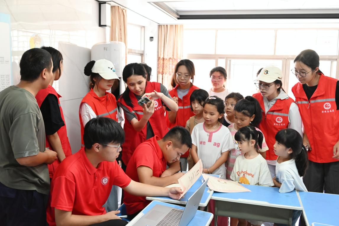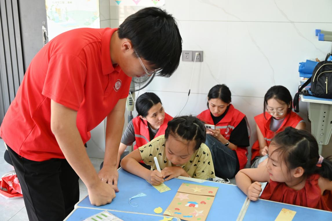 “小朋友们看,这颗五角星剪纸,就像当年红军战士帽檐上的星星……”在盛欣托管中心,实践队开设的“非遗剪纸里的红色课堂”热闹开课。队员黄燕彬结合漳浦剪纸的千年传承史与车本村红军故事,生动讲解红色主题剪纸的创作理念与技法,让孩子们在艺术启蒙中触摸红色历史。