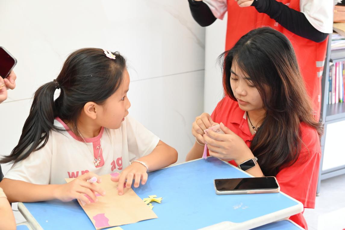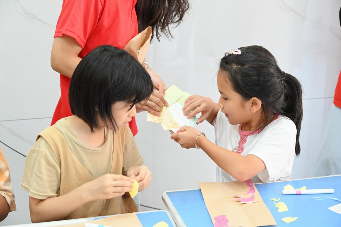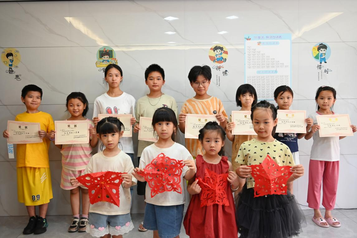 实操环节里,队员陈秋奕手把手教孩子们用“一刀剪” 技法裁出一颗颗小红心。孩子们专注地握着剪刀,稚嫩的小手虽略显笨拙,却格外认真。剪好的红心被小心翼翼地贴在帆布包上,变成独一无二的“红色文创”。活动尾声,队员们为每位孩子颁发“红色剪纸小卫士”奖状,当孩子们举起奖状露出灿烂笑容时,红色传承的种子已悄然在童真心田扎根。
