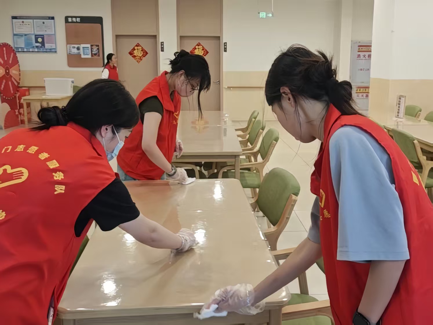 实践队秉持着“精细规划”的理念,提前划分公共区域责任分工,系统开展卫生清扫,确保环境整洁有序;同时关注长者活动需求,协助行动不便的长者安全下楼参与集体活动,既保障基础环境整洁,又创造舒适的活动空间。用细致服务筑牢关爱根基,彰显青年对“尊老敬老”社会责任的践行。