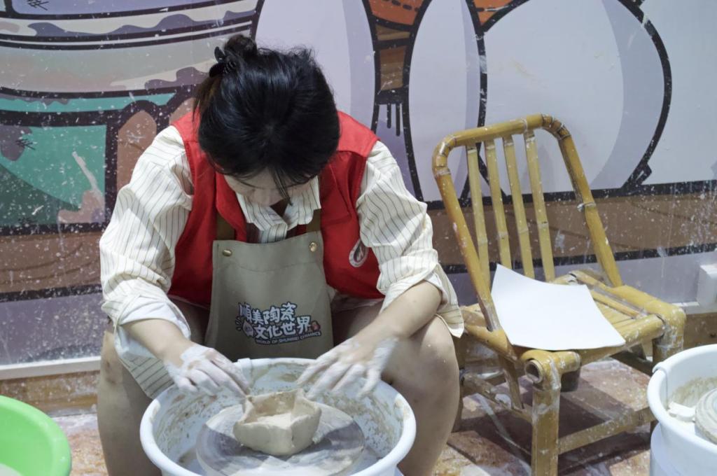 顺美陶瓷文化世界则展现了现代陶瓷产业的创新图景。先进生产工艺与精美产品的结合,让同学们见证了传统技艺与现代产业的融合活力。期间,团队参与特色手拉胚活动,在专业师傅指导下,从陶土塑形的生疏到逐渐掌握技巧,亲手完成专属作品。这一过程不仅让大家深入理解“水土既合,器质乃成”的造物哲学,更以实践深化了对陶瓷工艺的认知。