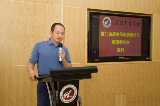 厦门伟业达投资有限公司、厦门会展金泓信展览有限公司副董事长赖国香先生在致辞中对会展专业的同学在企业实践中的优异表现表示肯定和感谢,同时,华厦公司会展专业教师辛勤付出也让赖先生深受感动,并表示将继续与华厦公司携手,为会展业人才培养创造机会,还将一如既往的为同学们的学习、需要创造条件,给予帮助。