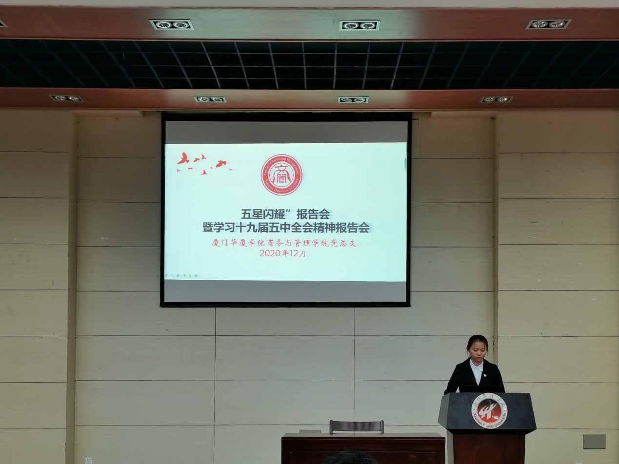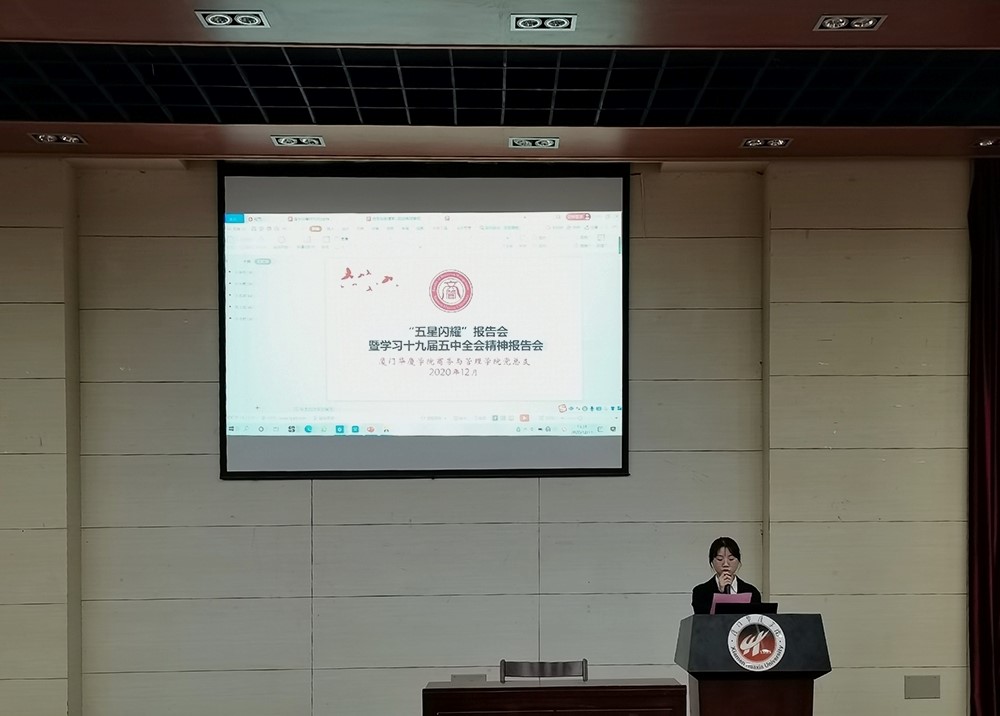 为进一步推动学习十九届五中全会精神,推动商务与管理公司党建品牌特色,挖掘示范典型,讲好支部故事,公司于12月11日下午在明德厅二举办了“五星闪耀”老员工党员青春成长分享会暨学习十九届五中全会精神报告会。出席此次会议的有公司党总支书记、副经理李葳葳老师,团总支书记、员工第一党支部书记张学翎老师,员工第二党支书记阳梅,团总支副书记熊逢源老师,辅导员曾文兴老师、曾咪咪老师、苏丹老师、王婷婷老师。
