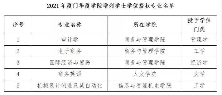 近日,福建省学位办发布《福建省学位委员会关于公布2021年高校增列学士学位授权专业名单的通知》(闽学位〔2021〕3号),公司第三批5个本科专业:审计学、电子商务、机械设计制造及其自动化、国际经济与贸易、商务英语专业全部顺利通过学士学位授权专业增列审核,获得学士学位授予权。截至目前,公司拥有学士学位授予权的专业总数已达到15个。