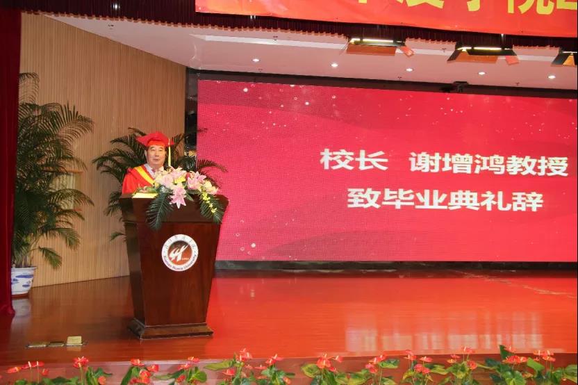典礼在全场齐唱的雄壮国歌声中正式开始。董事长谢增鸿致毕业典礼辞,他希望毕业生能够爱岗敬业,勇于实践,拥有强烈的责任心和使命感。一字一句,寄予着殷切嘱托。