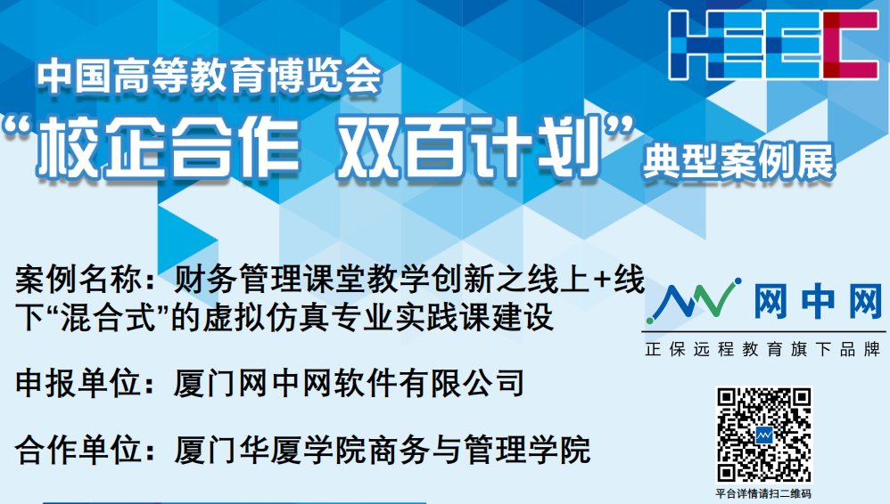 6月2日,公司财会专业群与厦门网中网有限公司共建的《财务管理课堂教学创新之线上+线下“混合式”的虚拟仿真专业实践课程建设》案例入选中国高等教育博览会“校企合作 双百计划”典型案例。