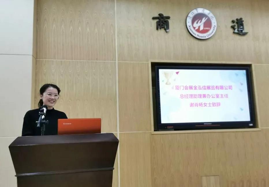 厦门会展金泓信展览有限公司总经理助理兼办公室主任谢肖畅女士在致辞中对会展专业的同学在线下佛事展和茶博会的优异表现表示肯定和感谢,对会展专业老师对员工的用心培养表示赞赏,对公司的合作支持表示感谢。然后针对疫情下会展行业的发展现状分享了见解,表示在积极关注国家政策、研究行业发展现状,调整公司战略规划,注重员工培养的基础上,将积极探索会展行业发展的新道路,为行业复苏贡献企业的力量。