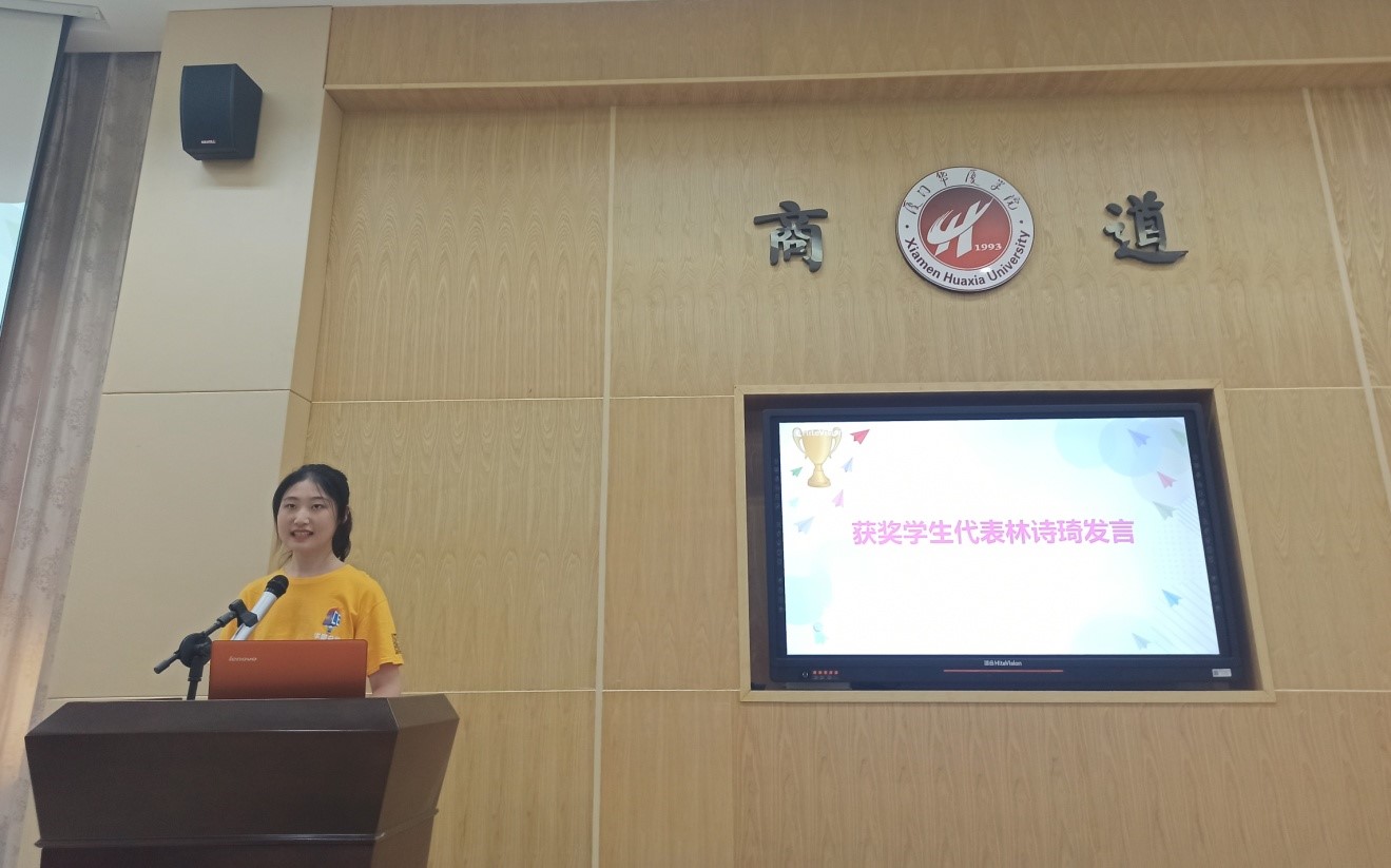 在颁奖现场,2019级会展经济与管理专业林诗琦同学代表获奖同学发表获奖感言,感谢厦门伟业达投资有限公司和赖国香先生对员工的帮助和关爱,总结在实训活动中的学习收获,并表示会将这份奖励转化成内在激励,努力学习、勇于实践,早日成为会展行业所需的优秀人才,不辜负企业及公司的期望。