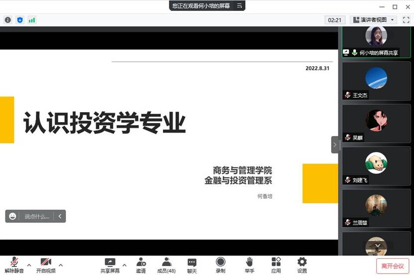 何香培老师在课上对专业进行简要的说明,让新生了解投资学专业的教学安排和发展前景,递进式地带领同学们走进投资学专业;谢园老师在课上给同学介绍了金融学专业校企合作相关内容,让新生了解公司的资源以及未来发展的平台。