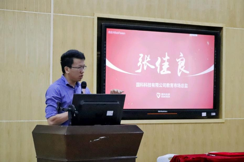 随后,国科科技有限公司教育市场总监张佳良先生致辞。他生动地描述了个人对校企合作、产教融合的理解。他表示合作、融合的最终目的就是为了快速培养适合企业要求的人才。企业将项目带给员工,让员工真正参与社会实践,从实践中获取真知。员工的成长自然就能反哺企业,促进企业发展。这样的校企合作是固本培元、立足长远的。另外,他也谈到,此次校企合作中企业也可以辅导员工参与竞赛,进一步促进人才的涌现萌发。