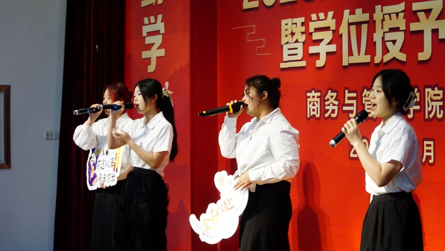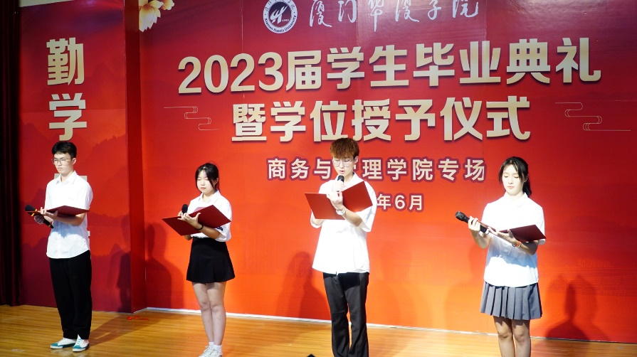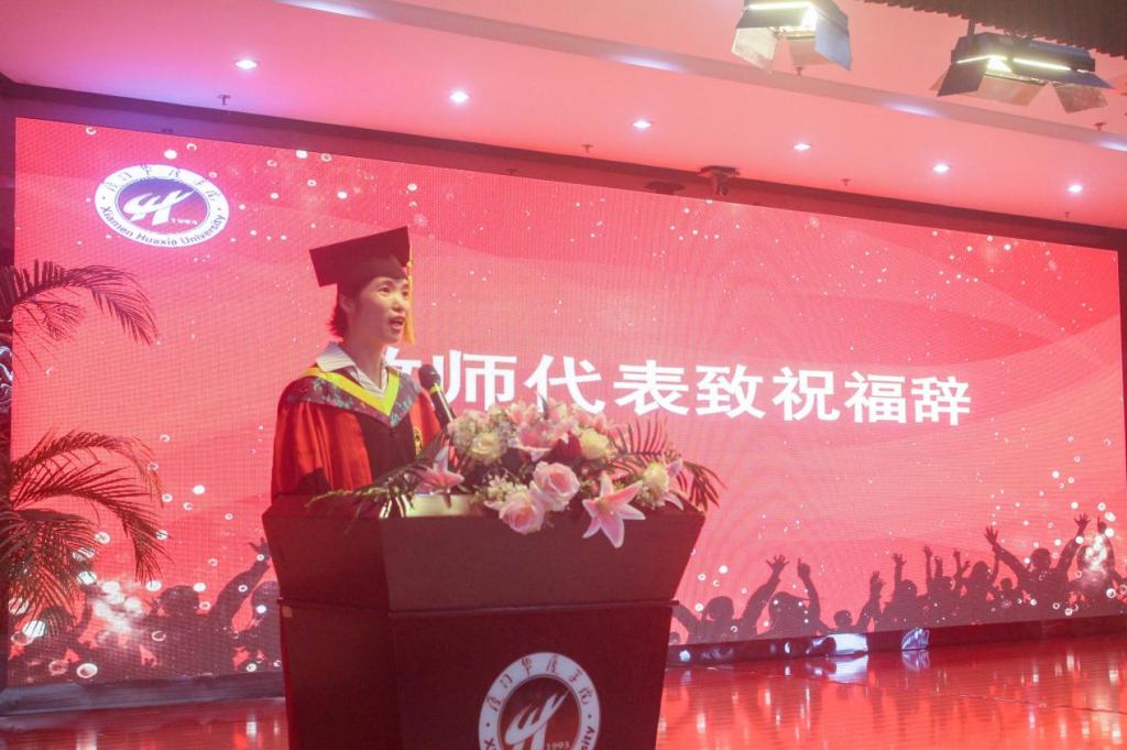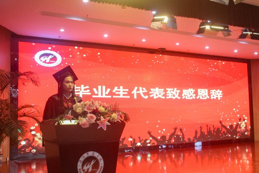 毕业生代表吴雅萱同学代表全体毕业生感恩母校和师长们的谆谆教诲,表示将继续脚踏实地,抓住时代机遇,践行华厦校训,成为一名不忘初心、艰苦奋斗,担当复兴大任的时代青年。