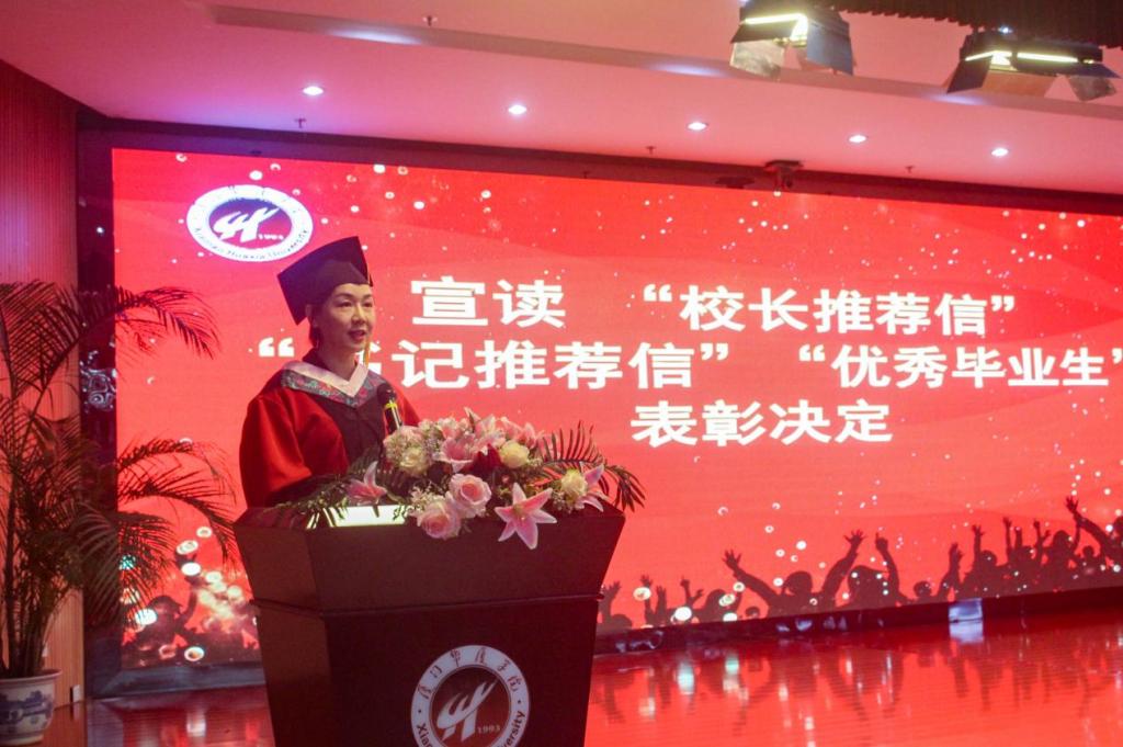教师代表许丽梅老师致祝福辞,希望同学们在未来的人生中不忘学习、勇于开窗、记得抬头,不断超越自我,肩负起时代使命与责任担当。
