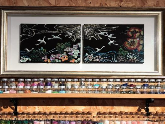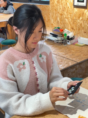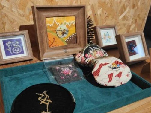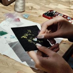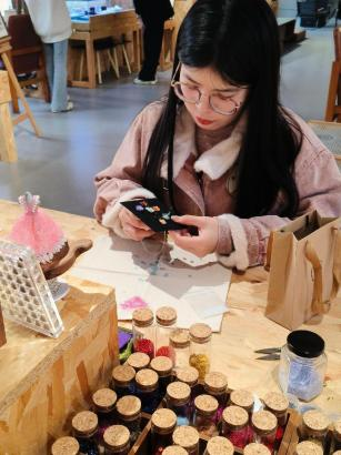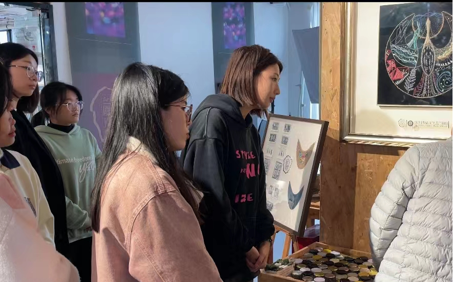 珠绣老师展示了珠绣的基本绣法及要领:精心、静心、尽心。实践队成员们认真听取老师的指导,亲身体验珠绣的制作。在经历了掉珠、歪珠、松珠、针扎手等情况后,成员们的珠绣作品逐渐成型,不由得让大家感叹一个作品的诞生不易,同时也感受到了珠绣的美轮美奂以及工匠背后的耐心与坚守,这也更坚定了让实践队成员们对非遗文化的热忱之心与传承之念。