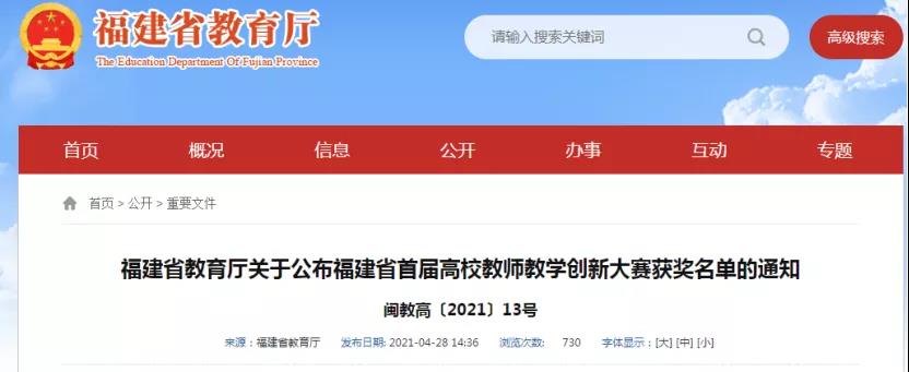 近日,福建省教育厅发布《关于公布福建省首届高校教师教学创新大赛获奖名单的通知》(闽教高〔2021〕13号),公司陈晖老师主讲的《供应链管理》教学团队(成员:陈晖、毛雅菲、陈民伟、叶新荣)荣获福建省首届高校教师教学创新大赛副高组三等奖。
