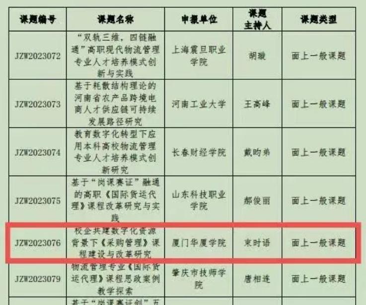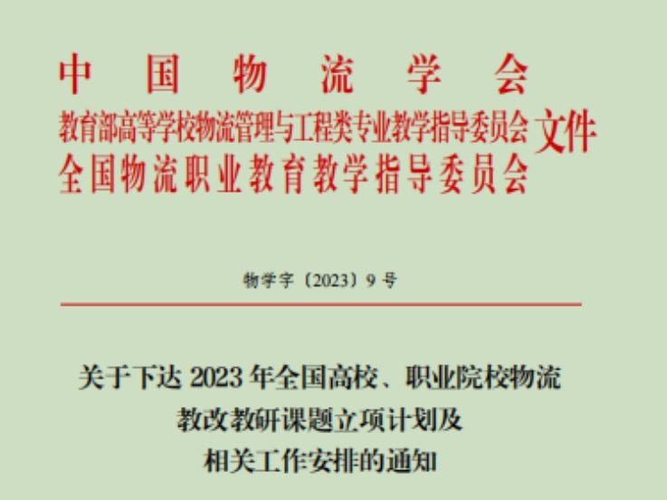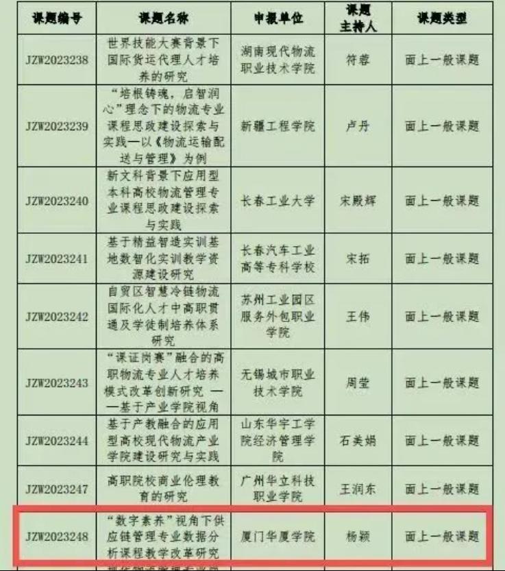 5月19日,教育部高等公司物流管理与工程类专业教学指导委员会、中国物流学会和全国物流职业公司产品指导委员会联合发文,公布了 “2023年全国物流教改教研课题计划”立项名单,由公司物流工程专业负责人陈晖副教授主持的《数字化背景下校企共育智慧物流人才的路径探索与实践》获培育课题立项,供应链管理专业杨颖老师主持的《“数字素养”视角下供应链管理专业数据分析课程教学改革研究》、物流工程专业束时语老师主持的《校企共建数字化资源背景下“采购管理”课程建设与改革研究》获得面上一般课题立项。