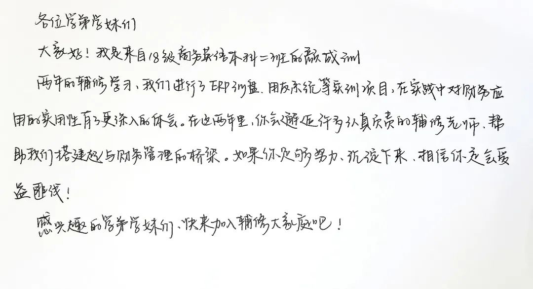 颜成洲同学代表全体财务管理辅修专业学姐学长们,已向学弟学妹们发出了热情的邀请——“欢迎加入辅修大家庭吧”!华厦学子们更待何时?