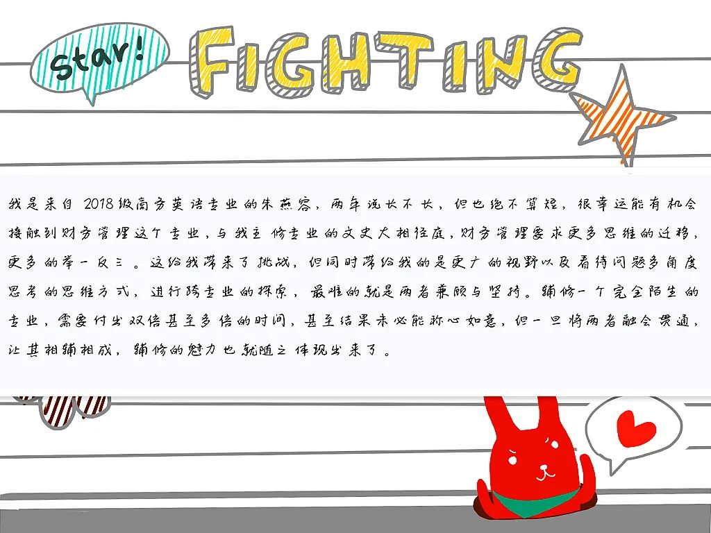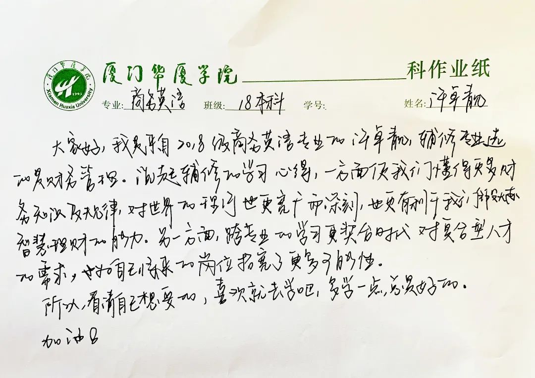 这是通达职涯的历程。许卓靓同学深切感受到了新时代下市场对复合型人才的热切需求,热情地投入到了财务管理辅修专业的学习中。作为应用型本科院校,助力员工成就高质量的职业理想是最重要的办学宗旨,引导财会专业“门外汉”通过跨专业学习“闯入”财会疆域,为他们耕耘出更广阔的职业禾场,拓展出更丰富的成才空间,老师们秉持有教无类,同学们定将不虚此行。“商务英语是我的门面,而财务管理能作为我的底牌”朱燕容同学说出了小伙伴们的心声,他们将以游刃有余的自信去迎接精彩无限的职业人生。