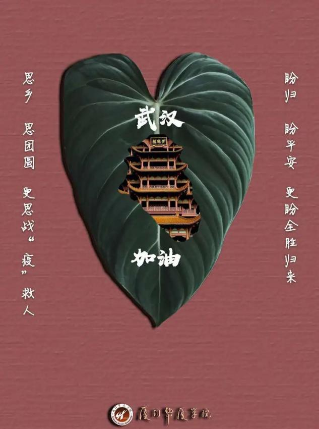 作品说明:红色的背景代表着中国;绿色的叶子是爱心的图案,代表着全国人民一致抵抗疫情,战胜疫情的决心;绿色又是生机的代表,表示武汉终会度过疫情,迎来充满活力,充满生机的新的一天。