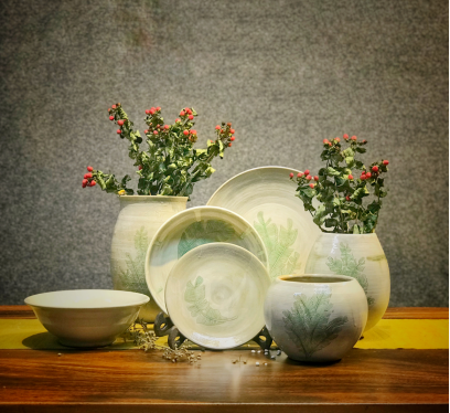 人文公司员工创业工作室——“东瓦工坊”和会展员工创业企业——厦门致得会展有限公司,承办了此次参展工作。此次参展展品主要为师生创作的陶瓷作品,还有部分绘画作品。“东瓦工坊”的“蕉夏”、“二十四节气”、“木叶盏”等陶瓷作品吸引了国内外客商的关注,接到了马来西亚、新加坡、韩国等一些客户的咨询和订单。这意味着公司艺术类师生的文创作品又朝着市场化和产业化迈进了一步。在厦门地铁报《城市捷报》发起的“最受欢迎展品”投票中,公司的参展作品《蕉夏时光》以绝对优势获得了第一名。 张晓慧老师介绍,芭蕉是文学作品中常用来寄托作者情绪的一种意象,该作品采用了粉青雕花和釉下雕花相结合的技艺,是市场上比较少见的。