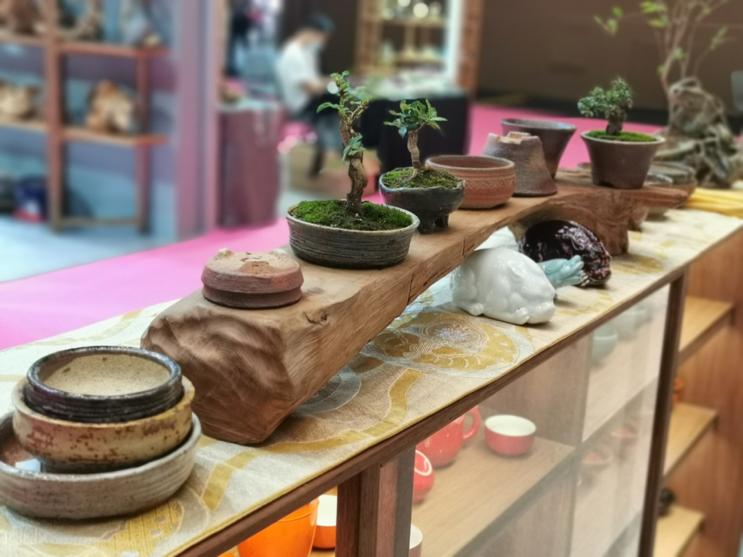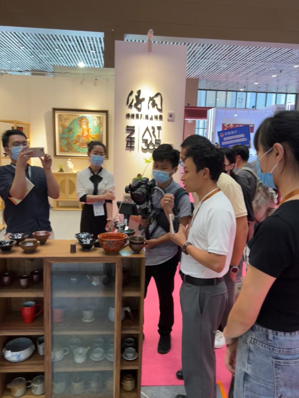 此次参展作品,以建盏、花器、茶具等陶瓷作品为主,作品造型精美,色彩丰富,吸引了众多观众的驻足欣赏。建盏创作大师——苏奕堂老师,现场运用高倍放大镜,为观众展示建盏中深藏的——“青绿山水“、“繁花盛开”等精美工艺,现场观众纷纷称赞不已。