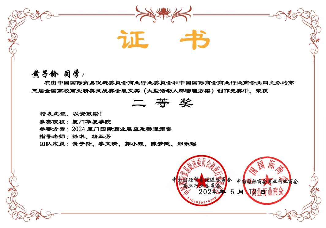 此次竞赛吸引了来自全国 30 个省、市、自治区、澳门特别行政区 226所高校443支队伍报名参赛。根据竞赛相关规则、实施细则要求,经部分省赛选拔、组委会初评、评选专家复评、评审委员会审核,最终有 158 所高校 312 支队伍,1900 余名员工入围全国总决赛。由尹芳老师指导,黄桦瑶、乔梦、田原、郭雅琳、何昊翔团队完成的作品“2024建发厦门海沧半程马拉松赛人群管理方案”获得一等奖;由孙琳老师和靖亚芳老师指导,黄子铃、李文晴、郭小珏、陈梦随、郑乐瑶团队完成的作品“2024厦门国际酒业展应急管理预案”获得二等奖。