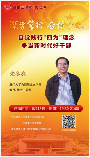 本次直播云课堂第七讲,由厦门大学教授、博士生导师朱冬亮教授为我们讲解了“自觉践行‘四为’理念,争当新时代好干部”。主要分为三个部分:“四为”理念提出的背景、对“四为”理念内容的解读以及“四为”理念的时代价值。想作为,强调态度和责任精神;勤作为,强调奋斗和实干精神;善作为,强调实干和智慧精神;敢作为,强调勇气和担当精神。新时代广大青年干部要努力做一个“四为”的新时代青年,树立奋斗为荣的精神,自觉把个人奋斗融入到党和人民的共同奋斗中,敢于挑急难险重的担子,乐于到祖国需要的艰苦地方锻炼,致力于中国特色社会主义的伟大建设中。