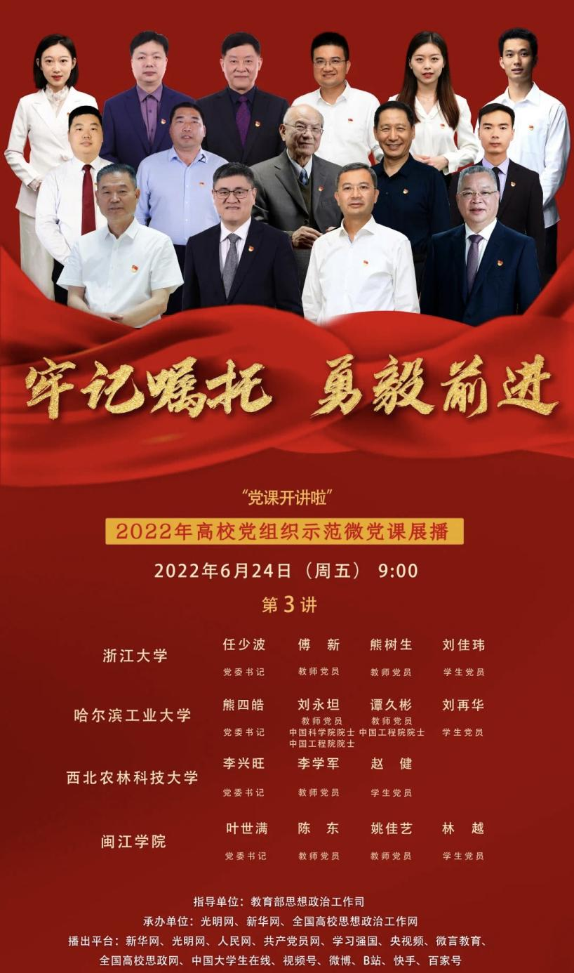 “牢记嘱托,勇毅前进”2022年高公司党组织示范微党课第3期于6月24日上午9点在新华网、光明网、人民网、共产党员网等十余个平台同步上线,由浙江大学、哈尔滨工业大学、西北农林科技大学、闽江公司4所高公司党委书记和师生代表,围绕学习贯彻习近平总书记考察公司重要讲话或给公司师生重要回信,展现公司牢记习近平总书记殷殷嘱托、扎根中国大地办大学的生动实践。