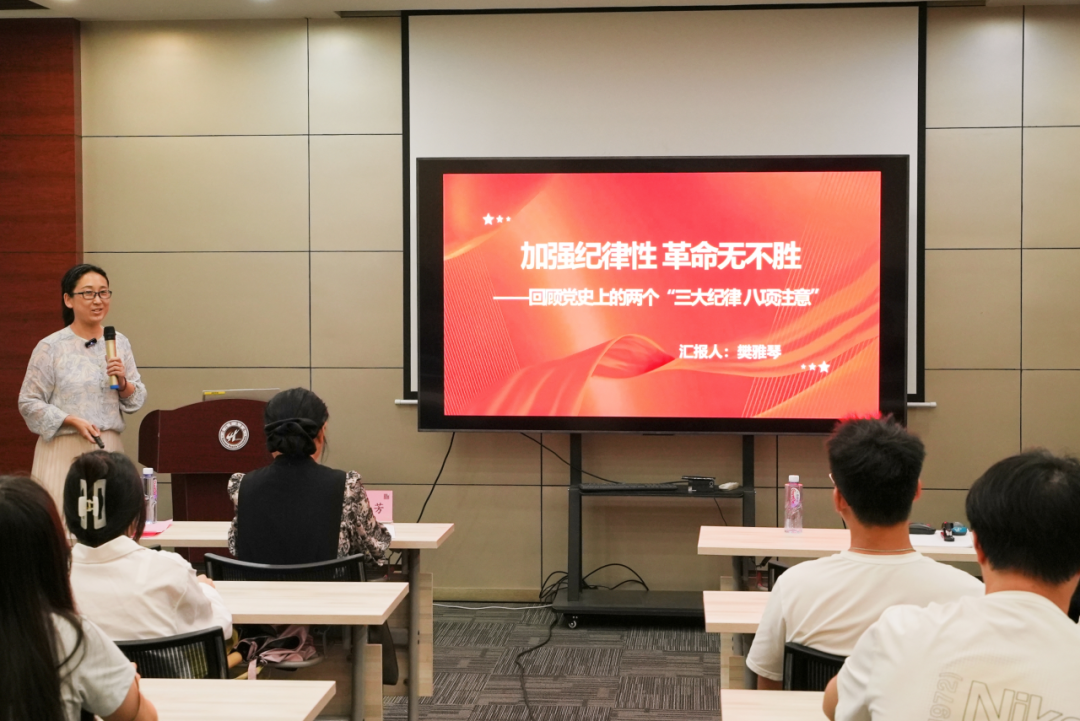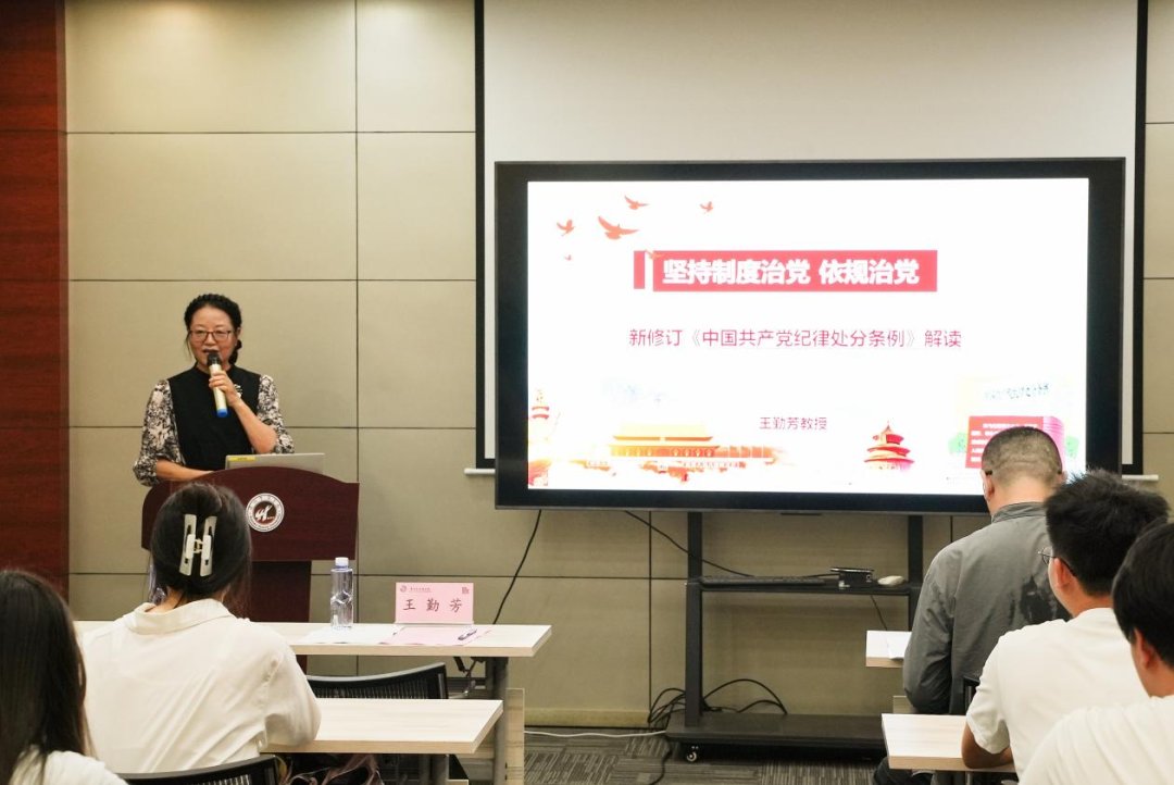 公司党委宣传部长孙键主持专题报告和教学展示环节。集美大学法公司教授、诚毅公司马克思主义公司经理王勤芳受邀作题为《坚持制度治党、依规治党——新修订的<中国共产党纪律处分条例>解读》的专题报告,报告结合中国共产党的百年历程,从自我革命、人民监督、依规治党、廉洁纪律、从严治党、党纪与国法等方面出发,结合一个个鲜活的案例,深入阐释修订《条例》的重要意义,要求全体党员师生认真学习贯彻《中国共产党纪律处分条例》,深刻领悟“两个确立”的决定性意义,坚决做到“两个维护”,使铁的纪律真正转化为日常习惯和自觉遵循。