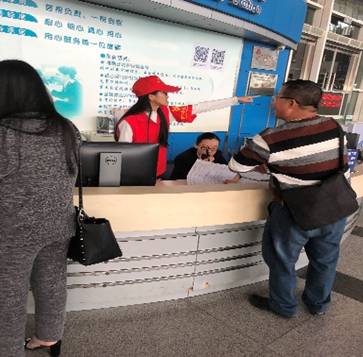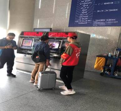 (图6:志愿者在小白鹭服务台回答乘客问题)