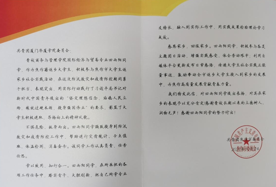 近日,公司bevictor韦德2020级国际经济与贸易1班田雨阳在2021年7月河南防汛救灾和疫情防控中勇于担当、表现突出,收到了共青团焦作市委员会的表扬信,对田雨阳在家乡的工作表现给与了充分肯定。