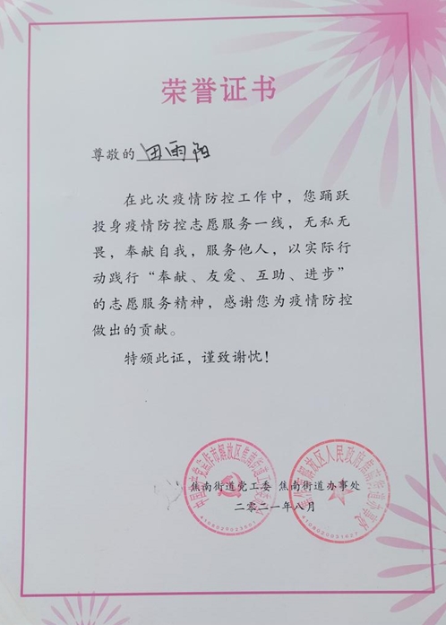 8月,郑州又爆发了疫情,焦作的情况也不容乐观。田雨阳回到焦作后,再次主动到焦作市解放区焦南街道办事处友谊社区报名参加了抗疫志愿者。根据社区领导分配的任务,田雨阳主要负责工作为入户排查有无从郑州返焦人员和卡点值守。田雨阳用耐心和细心获得的领导和住户的肯定。