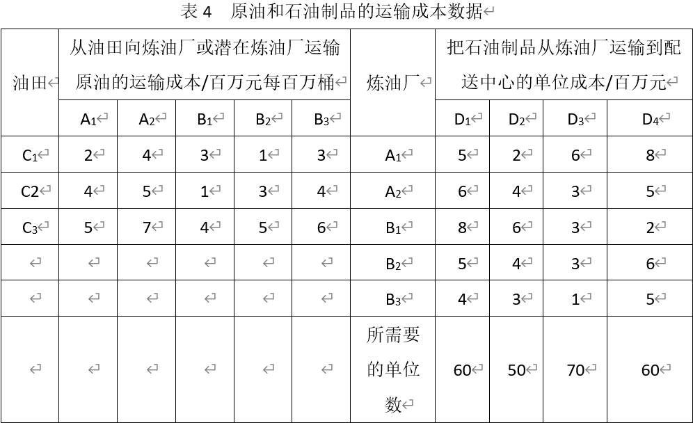 A公司是一家大型石油公司。公司拥有大型配送网络。把石油运送到公司的炼油厂,然后再把石油产品从炼油厂运送到公司的配送中心。A公司正在持续增加其几种主要产品的市场占有率,因此管理层决定建立一个新的炼油厂来增加公司的产量,接下来要做的决策就是确定在什么地方建设新的炼油厂。他们确定了三个非常有潜力和吸引力的备选地点。表中是A公司的一些相关数据,其中A1、A2是已有的炼油厂,B1、B2、B3是被选地点,C1、C2、C3是油田,D1、D2、D3、D4是配送中心。