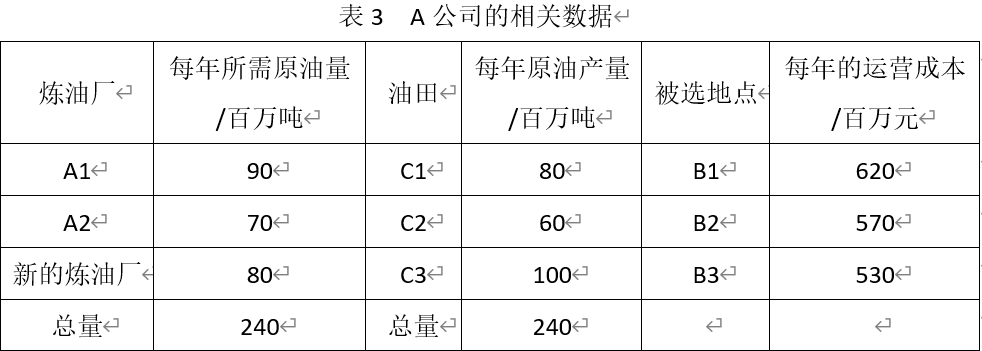 同理,如果选择在B2建造新的炼油厂可以得出最低的总原油运输成本为900万元,最低的总石油运输成本为910万元,如果选择在B3建造新的炼油厂可以得出最低的总原油运输成本为1060万元,最低的总石油运输成本为770万元。