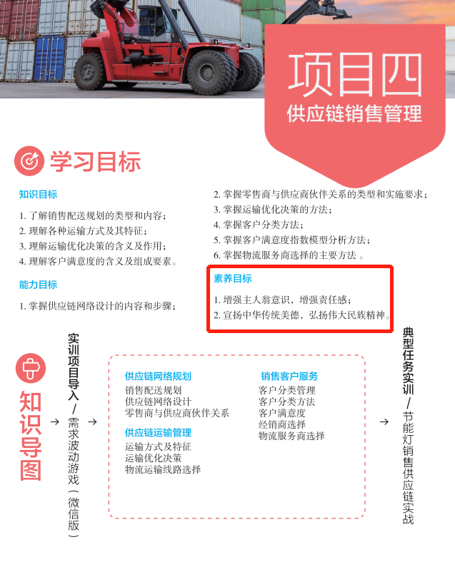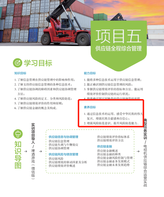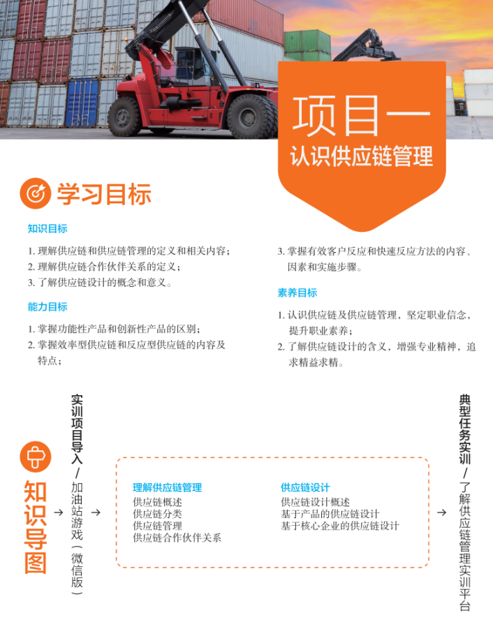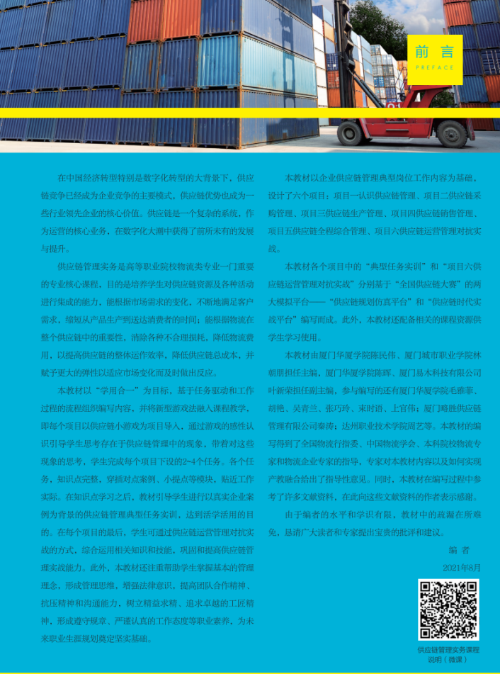 供应链体系是建设现代化产业体系的重要内容。在中国经济转型特别是数字化转型的大背景下,供应链竞争已经成为企业竞争的主要模式,供应链优势也成为一些行业领先企业的核心价值。供应链是一个复杂的系统,作为运营的核心业务,在数字化大潮中获得了前所未有的发展与提升。 供应链管理实务是高等职业院校物流类专业一门重要的专业核心课程,目的是培养员工对供应链资源及各种活动进行集成的能力,能根据市场需求的变化,不断地满足客户需求,缩短从产品生产到送达消费者的时间,能根据物流在整个供应链中的重要性,消除各种不合理损耗,降低物流费用,以提高供应链的整体运作效率,降低供应链总成本,并赋予更大的弹性以适应市场变化而及时做出反应。