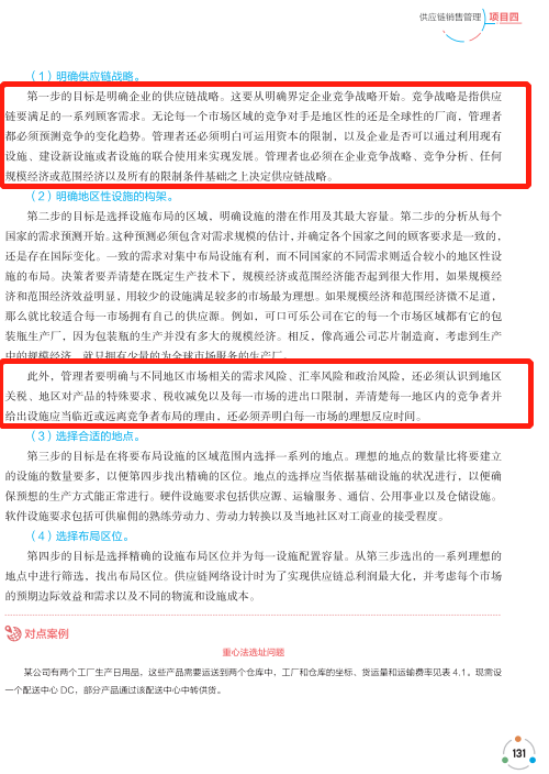 P131第一段最后加“在战略上为加快建设制造强国、质量强国、航天强国、交通强国、网络强国、数字中国进行顶层设计,从供应链战略规划角度推进新型工业化。” 第三段更改为“此外,管理者要明确与不同地区市场相关的需求风险、汇率风险和政治风险,还必须认识到地区关税、地区对产品的特殊需求、税收减免以及每一市场的进出口限制,推动货物贸易优化升级,扩大面向全球的高标准自由贸易区格局。”