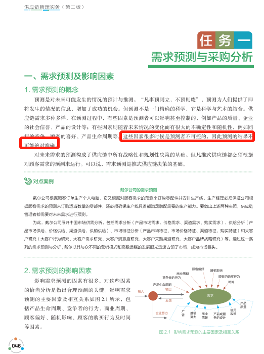 一、需求预测及影响因素 需求预测的概念 预测是对未来可能发生的情况的预计与推测。“凡事预则立,不预则废”,预测为人们提供了即将发生的情况的信息,增加了成功的机会。但预测不是一门精确的科学,它是科学与艺术的结合。供应链需求多种多样,在预测过程中,有些因素是预测者可以影响甚至控制的,例如产品的质量、企业的社会信誉、产品的设计等;有些因素则随着未来情况的变化而有很大的不确定性和随机性,例如同行的竞争、顾客的喜好、产品生命周期等。这些因素很多时候是预测者不可控的,因此预测的结果不可能绝对正确,应用普遍联系的、全面系统的、发展变化的观点进行预测。 对未来需求的预测构成了供应链中所有战略性和规划性决策的基础。但凡推式供应链都必须根据对顾客需求的预测来运行。可以说,需求预测是推式供应链决策的基础。